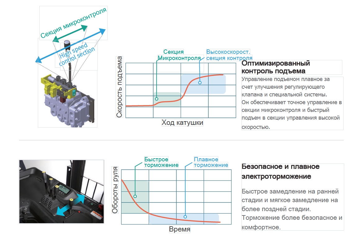 Прежде всего, работа мачты - плавная, точная и отзывчивая. Oбработка тяжелых грузов более безопасна и комфортна.