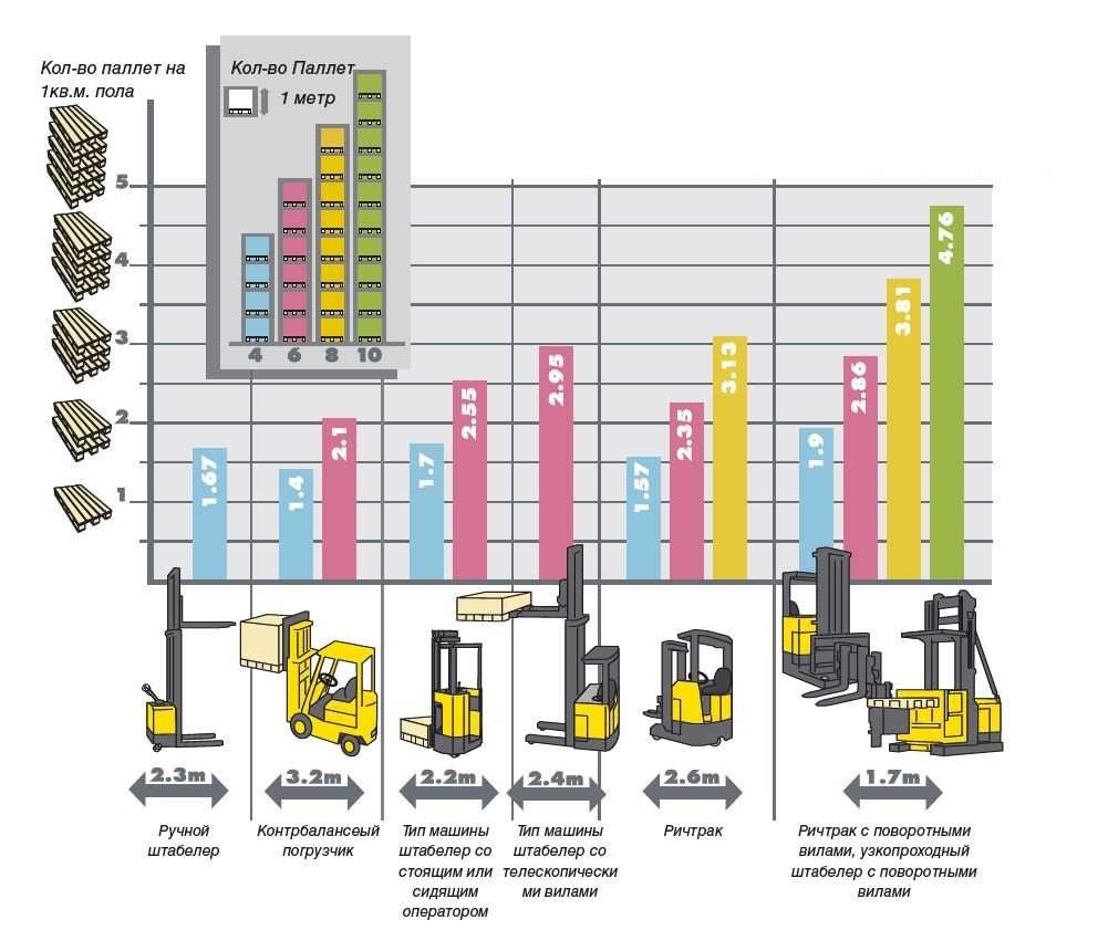 • маневренность. Она определяется минимальным радиусом разворота. Подбирать данный параметр нужно исходя из ширины проходов между стеллажами.