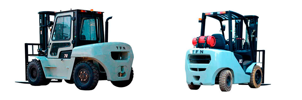 TFN R работает на дизельном топливе. Отлично подходят для открытых площадок, не требуют особого ухода. Поставляются с моторами Isuzu (или Cummins, Yantmar), коробками передач TCM. От 1,5 до 16 тонн.