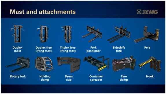 - Дуплексная мачта, Дуплексная мачта со свободным подъемом, Триплексная мачта со свободным подъемом, Позиционер вил, Вилка бокового смещения, Полюс, Поворотная вилка, Удерживающий зажим, Барабанная хлопка, Разбрасыватель контейнеров, зажим для шин, крюк.