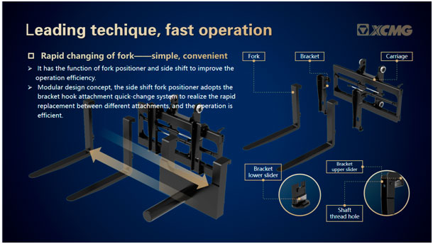 - Концепция модульной конструкции, позиционер вил бокового смещения использует систему быстрой смены навесного крюка для быстрой замены различных насадок.