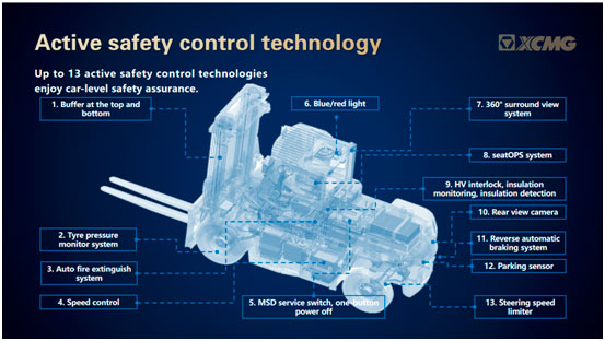 Электрический вилочный погрузчик с противовесом разработан независимо на основе высоковольтных электрических машин производства XCMG Port Machinery. Он имеет несколько ключевых технологий, таких как высоковольтные литиевые батареи, управление синхронным двигателем с постоянными магнитами, интеллектуальное управление температурным режимом, рекуперация энергии и активный контроль безопасности вилочных погрузчиков.