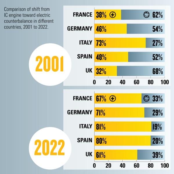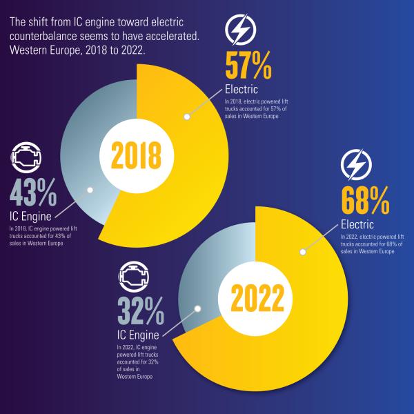 За последние 20 лет мы стали свидетелями того, как вилочные погрузчики с противовесом с двигателем внутреннего сгорания теряют свое доминирование на рынке Западной Европы. Продажи выросли с 60:40 в пользу двигателей внутреннего сгорания в 2001 году до 32:68 в пользу электрических двигателей в 2022 году. Это последний год, по которому на момент написания статьи доступны полные данные (см. рисунок 1).