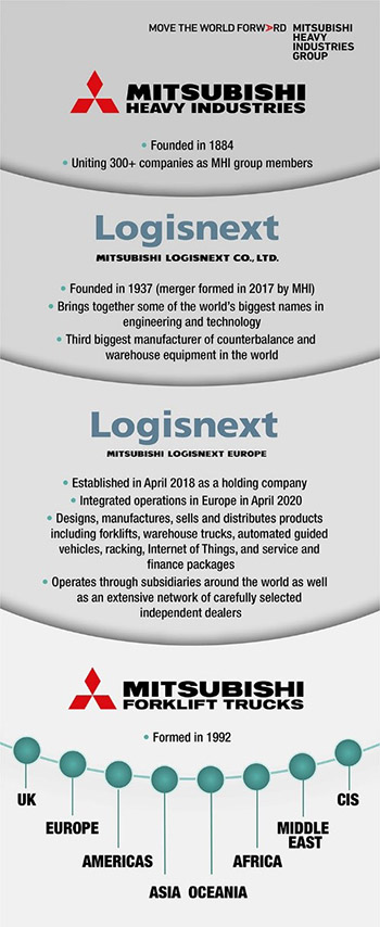 Mitsubishi Forklift Trucks построили свою репутацию на исключительной надежности погрузчиков. Mitsubishi Forklift Trucks гордится тем, что является частью компании Mitsubishi Logisnext Europe (MLE). MLE является частью глобальной группы Mitsubishi Logisnext — Mitsubishi Logisnext Co. Ltd (ML), базирующейся в Киото, Япония. Основанная в 1937 году, компания ML является ведущим поставщиком инновационных решений в области логистики и погрузочно-разгрузочных работ, работающим в Африке, Америке, Азии, Европе, на Ближнем Востоке и в Тихоокеанском регионе. ML стремится поддерживать общество и вносить свой вклад в него посредством новаторских достижений в области аппаратного и программного обеспечения. В свою очередь ML является частью группы Mitsubishi Heavy Industries.