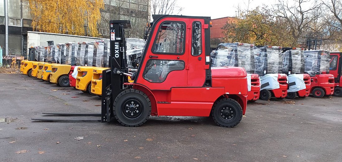 Вилочный дизельный автопогрузчик OXMI 5 тонн с кабиной и отопителем на складе Корвет-М в Москве и Санкт-Петербурге.